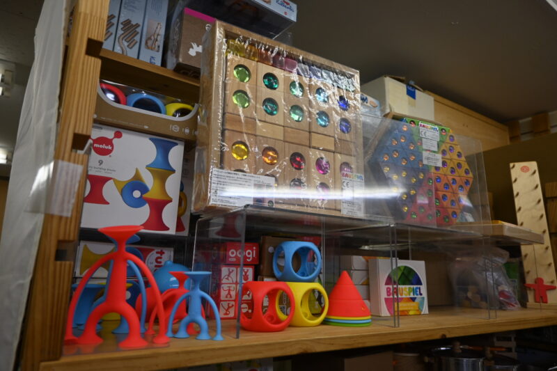 店内は、手前に販売スペースがあり、奥にはサンプルのおもちゃをお試しできるプレイスペースが開放されています。コロナ禍より前はプレイルームとして利用されていたそうです。